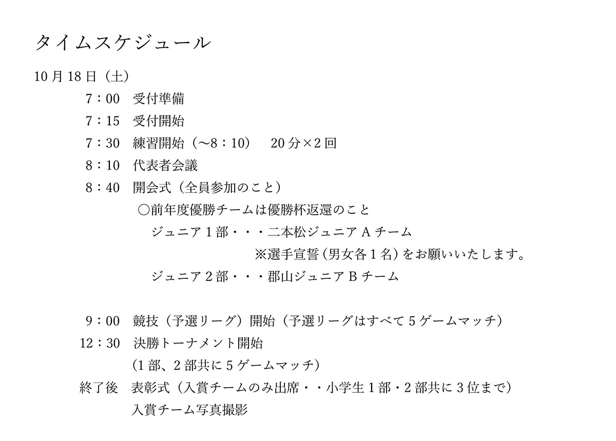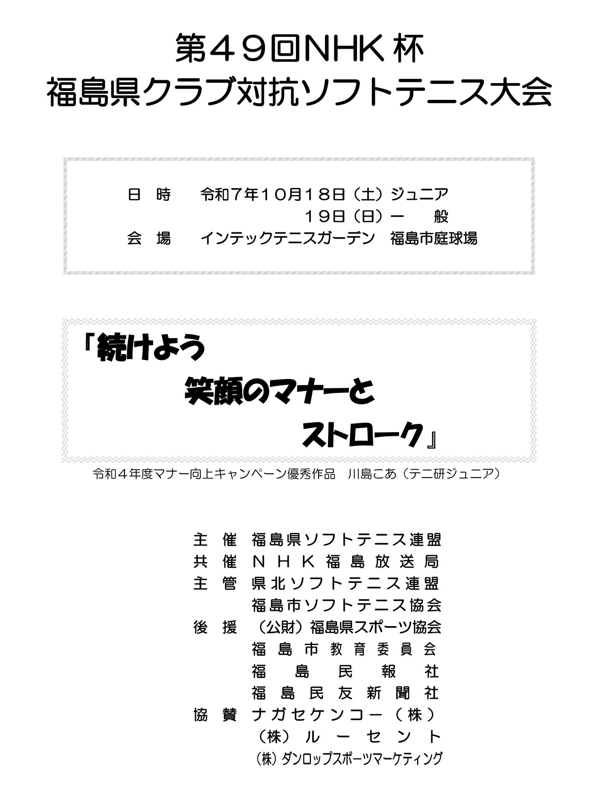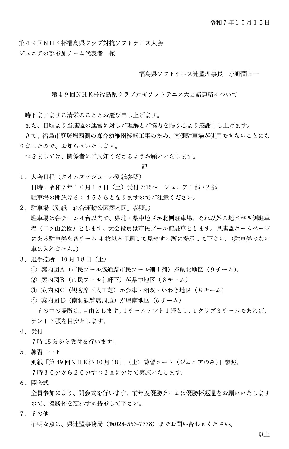 2025年10月15日2025年10月15日 fukushima-sta-adplayers NHK杯クラブ対抗ソフトテニス大会プログラム(ジュニアまとめ) R7.10.15_諸連絡(ジュニアの部) R7福島市庭球場配置図 駐車許可証(一般用・役員用)