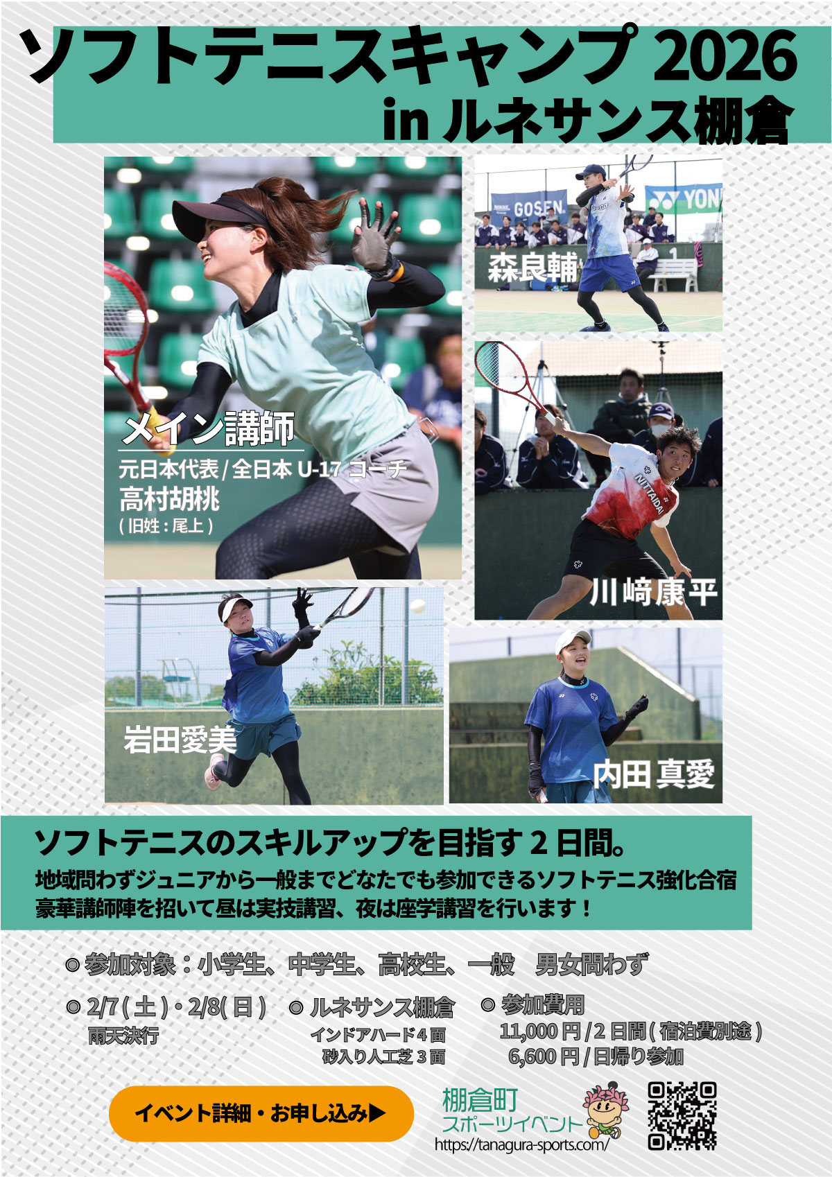 2026年1月8日2026年1月9日 fukushima-sta-adplayers 2月7日(土)・8(日)にルネサンス棚倉にてソフトテニスキャンプが開催されますので、奮ってご参加ください(申し込み締切1/31)。 地域問わずジュニアから一般までどなたでも参加できるソフトテニス強化合宿です。一流の講師を招いて昼は実技講習、夜は座学講習を通じてソフトテニスのスキルアップを目指す2日間。今回はメイン講師として元日本代表の尾上胡桃さん、サブ講師として日本体育大学の現役選手が参加します。 >>配布用PDFダウンロード イベント詳細・お申し込みは下記リンク(棚倉町スポーツイベントサイト)よりご確認ください。