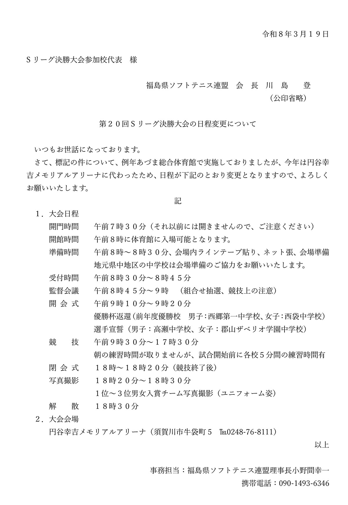 第20回Sリーグ決勝⼤会の⽇程変更について